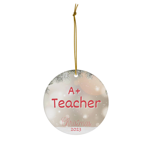 A+ Teacher Christmas Ornament SANTA Colored Lights Accent in Ceramic Glossy Finish for Best Teacher Ever Gift this 2023 holiday season!